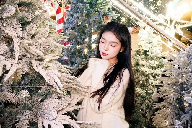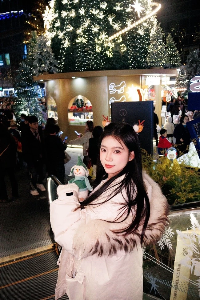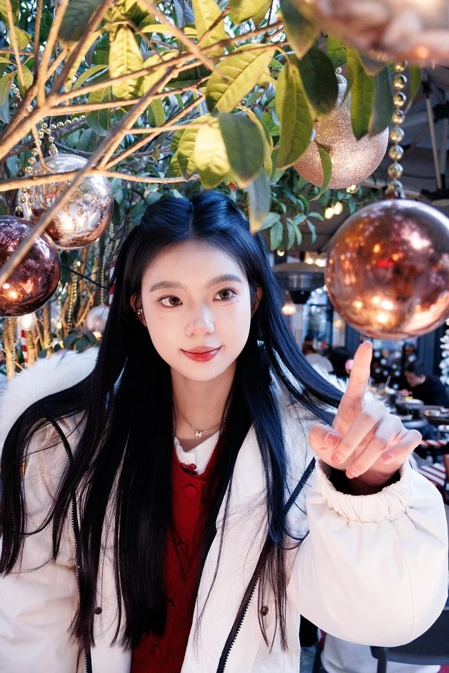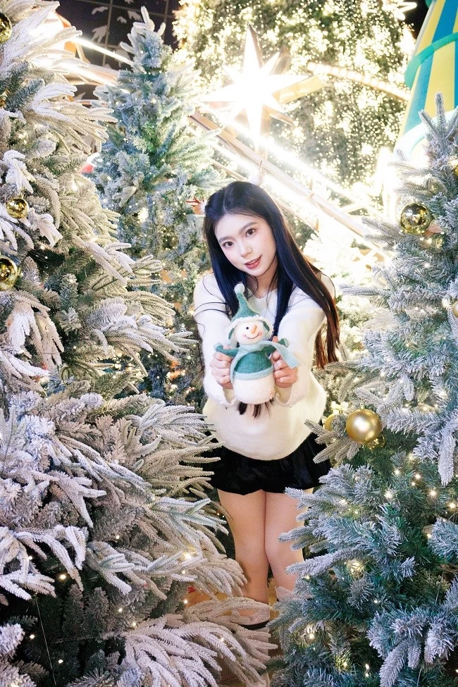 肤色呈现出自然的暖调红润感,搭配圣诞主题的红色毛衣,衣服的正红色和背景里彩色针织圣诞树的色彩层次分明,不用懂“色彩搭配”,R100 的色彩调校会帮你把人像和场景氛围完美融合。