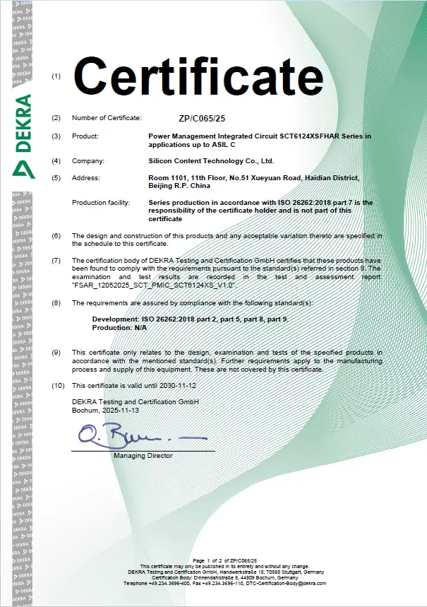 2025年11月14日,在MUNIK秒尼科技术的专业助力下,芯洲科技(北京)股份有限公司(以下简称“芯洲科技”)顺利通过ISO 26262:2018 ASIL-C汽车功能安全PMIC产品认证,并获得由全球领先的检验检测认证机构DEKRA德凯颁发的功能安全产品认证证书。这一认证证书的获得标志着芯洲科技已被认证拥有完善且合规的产品,公司能够从概念设计到生产运维每一个环节都严格遵循汽车行业最严格的规范,开发出高性能、高可靠性的产品。